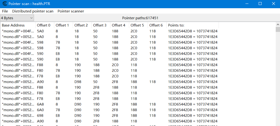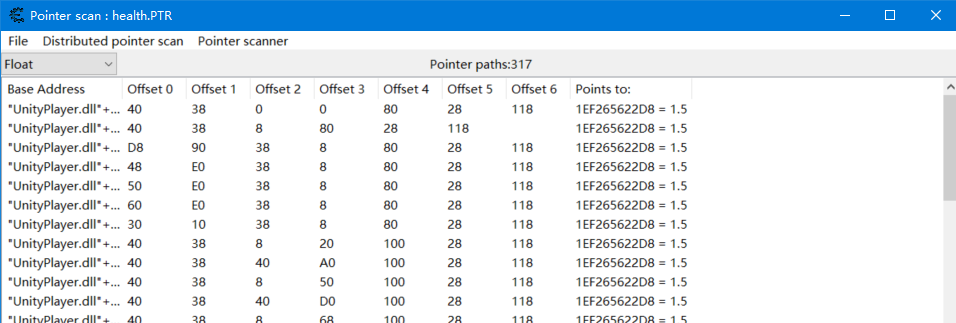 实际上这一过程就是查找基址和偏移量的过程,由于每次搜索对象的基址都会出现很多地址,那么可以通过记录这些地址和偏移量让程序自动寻找到所有可能的指针路线。