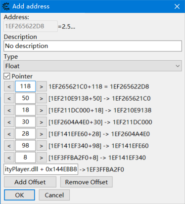 例如我找到了一个地址 UnityPlayer.dll + 0x144EBB8,经过测试发现这个地址确实是静态的,并且每次重新启动游戏都不会变动。现在可以在 CE 中选择 Add Address Manually ,添加一个指针