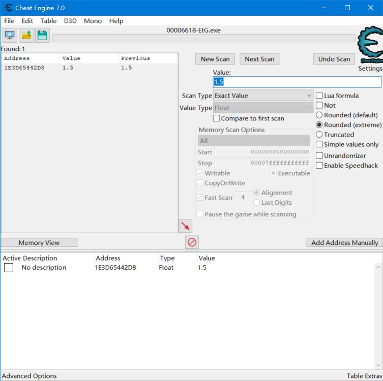 那么在 CE 中查找确切的值,float 类型,重复搜索,最后能够找到一个地址: