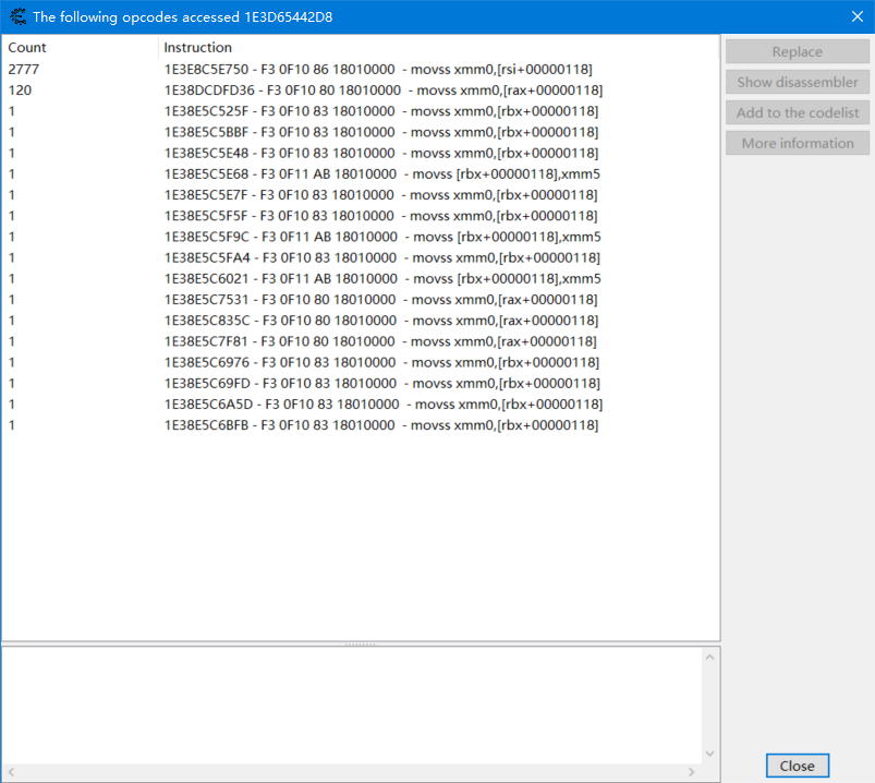 右键点击这个地址,选择 find what access this address 选项,CE 会自动附加一个调试器到游戏上,并且在目标地址添加一个硬件访问断点,之后所有访问了这个数据的指令都会被记录下来。
