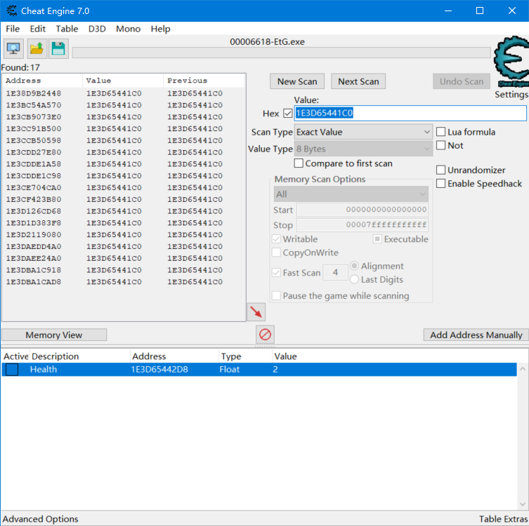 那么是不是 xxx 寄存器中保存的数值就是静态地址呢?我们可以选中某条指令找到寄存器中的数据,在 CE 中以 hex 形式搜索,能够找到很多结果: