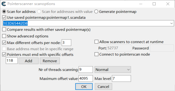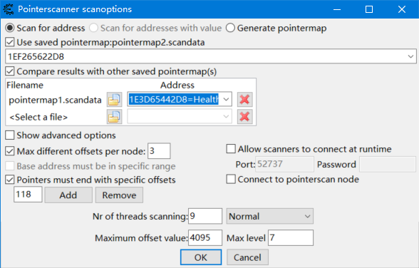 这种查找方式在 CE 中被称为指针表。右键血量地址即可看到 pointer map 选项,我们可以对血量这个地址生成一个指针表,然后选择指针扫描选项,在弹出的窗口中选择使用指针表,并设置结尾偏移量必须是 0x118:
