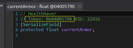 单从逆向结果上看并不能确定这个类就和角色血量有关,此时我们可以结合 CE 修改来确定。首先在 dnSpy 中点击成员变量的 Token