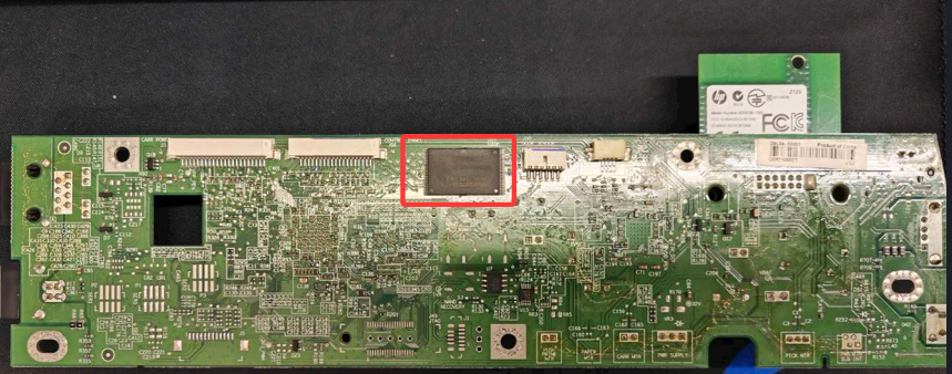 由于没有公开的固件解密方法,并且暂时也无法获取设备的 Shell 权限,我们考虑直接从设备 Flash 芯片中读取固件内容。将打印机拆机后取出主板,在主板背面可以找到一颗型号为 29f2g08abaea 的 NAND Flash 芯片,如下图所示(红色方框):